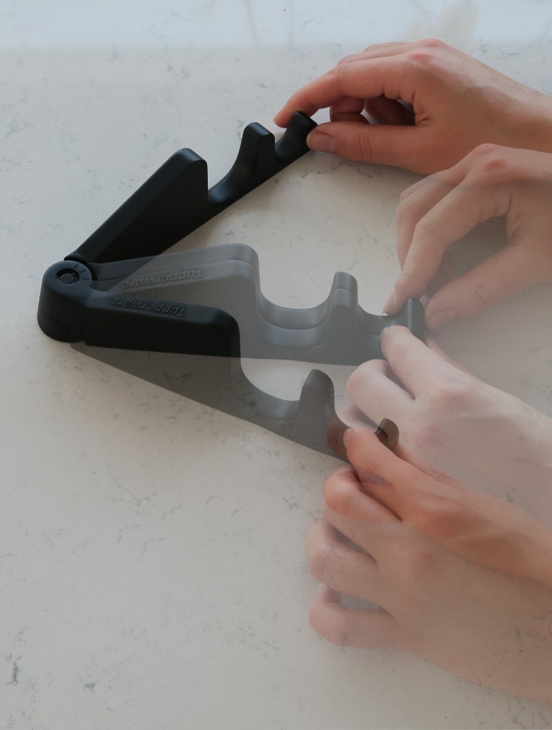 Depuis quelques années, Tupperware a mis sur pied un programme de recyclage de ses propres objets: vous pouvez renvoyer votre vieille boîte et celle-ci sera transformée en… à ce jour seuls deux objets ont été mis en production (une raclette et un porte-bouteilles). On nous a dès lors demandé d’étoffer cette famille en tenant compte d’une contrainte majeure: à cause du recyclage (et malgré le nettoyage des pièces), les objets doivent obligatoirement être destinés à un usage non-alimentaire. De plus, ces produits ont la particularité d’être tous de couleur noire : en effet, pour unifier les centaines de couleurs provenant des objets recyclés, une charge noire (ou très foncée) est ajoutée. Une dimension importante du projet aura donc été le déplacement de l’identité et des codes propres à Tupperware – très liés à la table – vers des produits non-alimentaires « sans couleur », ce qui peut représenter un écart important dans la perception de la marque. Un range-câble, un composteur de cuisine, un kit de nettoyage DIY, un support à tablette et livre de cuisine, un pot pour plantes aromatiques, une boite à savon, un vide-poche et des patères, ont ainsi vu le jour.
